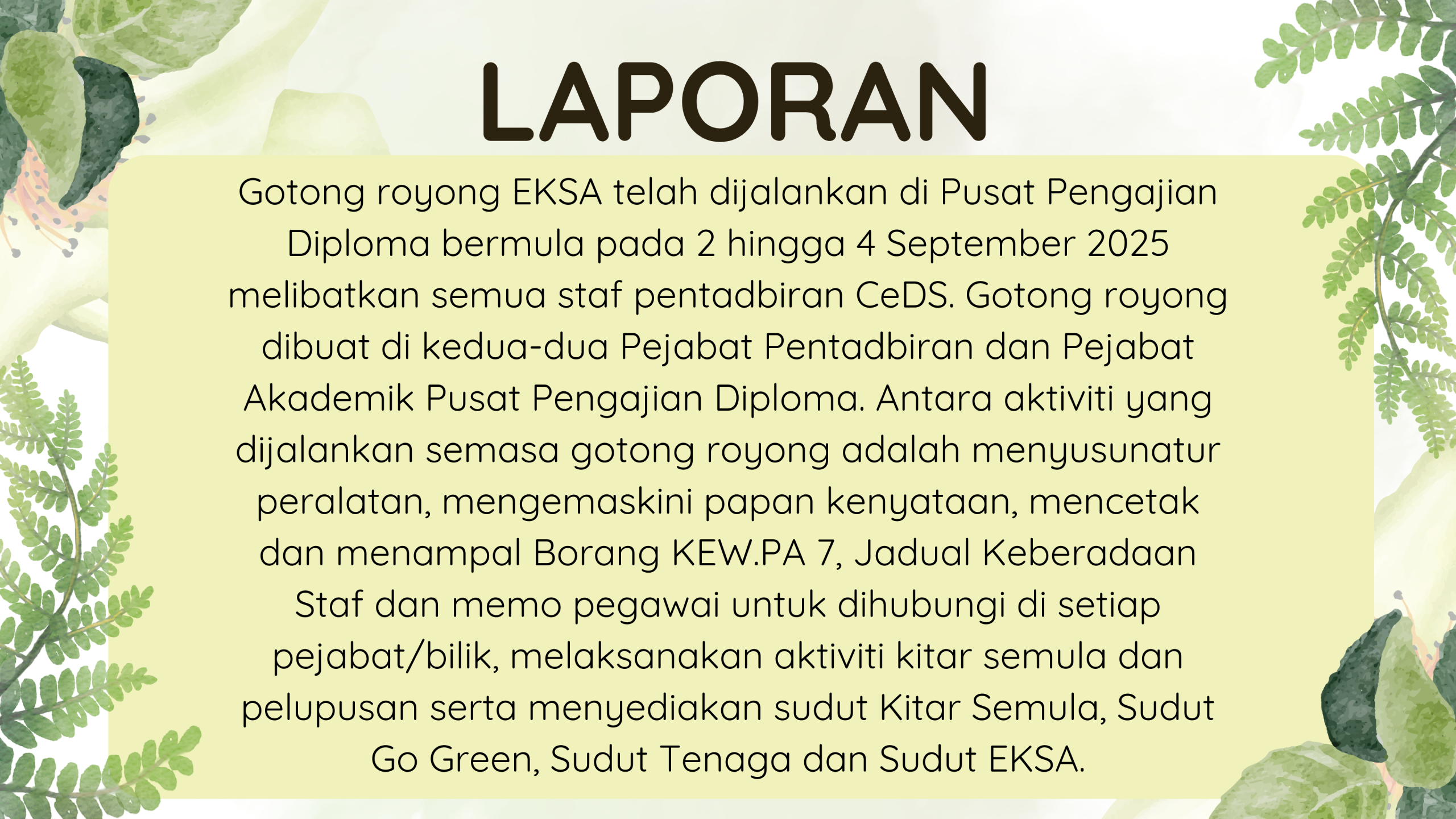 Ekosistem Kondusif Sektor Awam (EKSA) diperkenalkan sebagai penambahbaikan kepada Amalan 5S (Sisih, Susun, Sapu, Seragam, Sentiasa Amal) yang telah diamalkan di Universiti Hussein Onn Malaysia (UTHM) sebelum ini. Pelaksanaan EKSA bagi menggantikan Amalan 5S ini adalah selaras dengan usaha Unit Pemodenan Tadbiran dan Perancangan Pengurusan Malaysia (MAMPU) untuk membentuk identiti institusi yang unik.